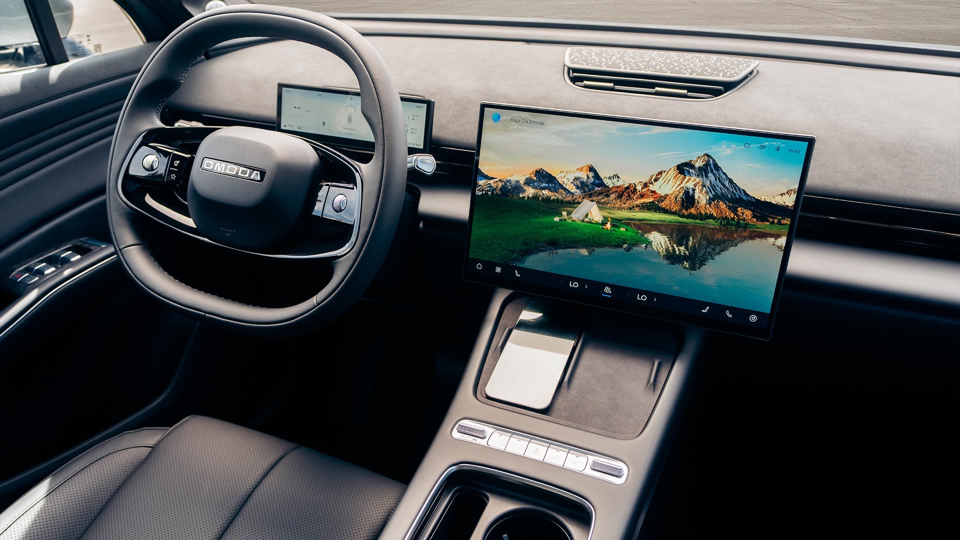 Central multimídia de 15,6" com Smart Sliding Com visual moderno e acabamento sofisticado, a tela de 15,6" Ultra HD 2.5K traz mais sofisticação à cabine. A função Sliding permite que a tela sensível ao toque se movimente livremente pelo painel.